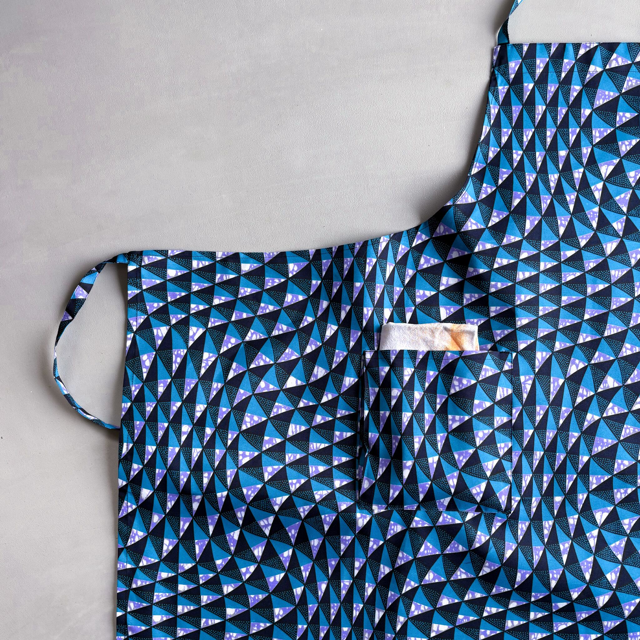 アフリカンワックスプリントを使った魅力あふれるエプロンです。色鮮やかなデザインが特徴で、キッチンでの作業を楽しませてくれること間違いなしです!肩紐は調整可能で、さまざまな体型の方にぴったりフィットします。