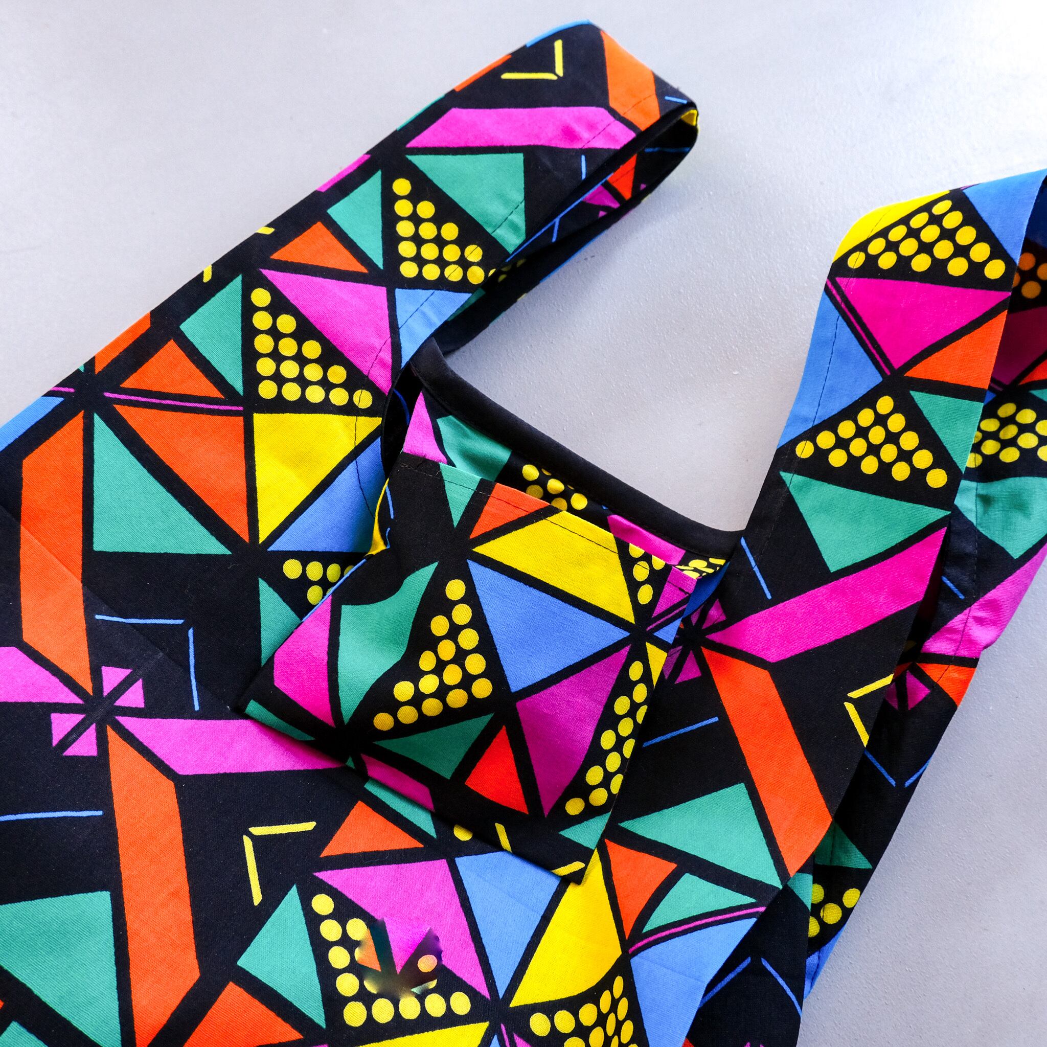 配色、柄が魅力的なアフリカンファブリックを使った、ショッピングバッグです。